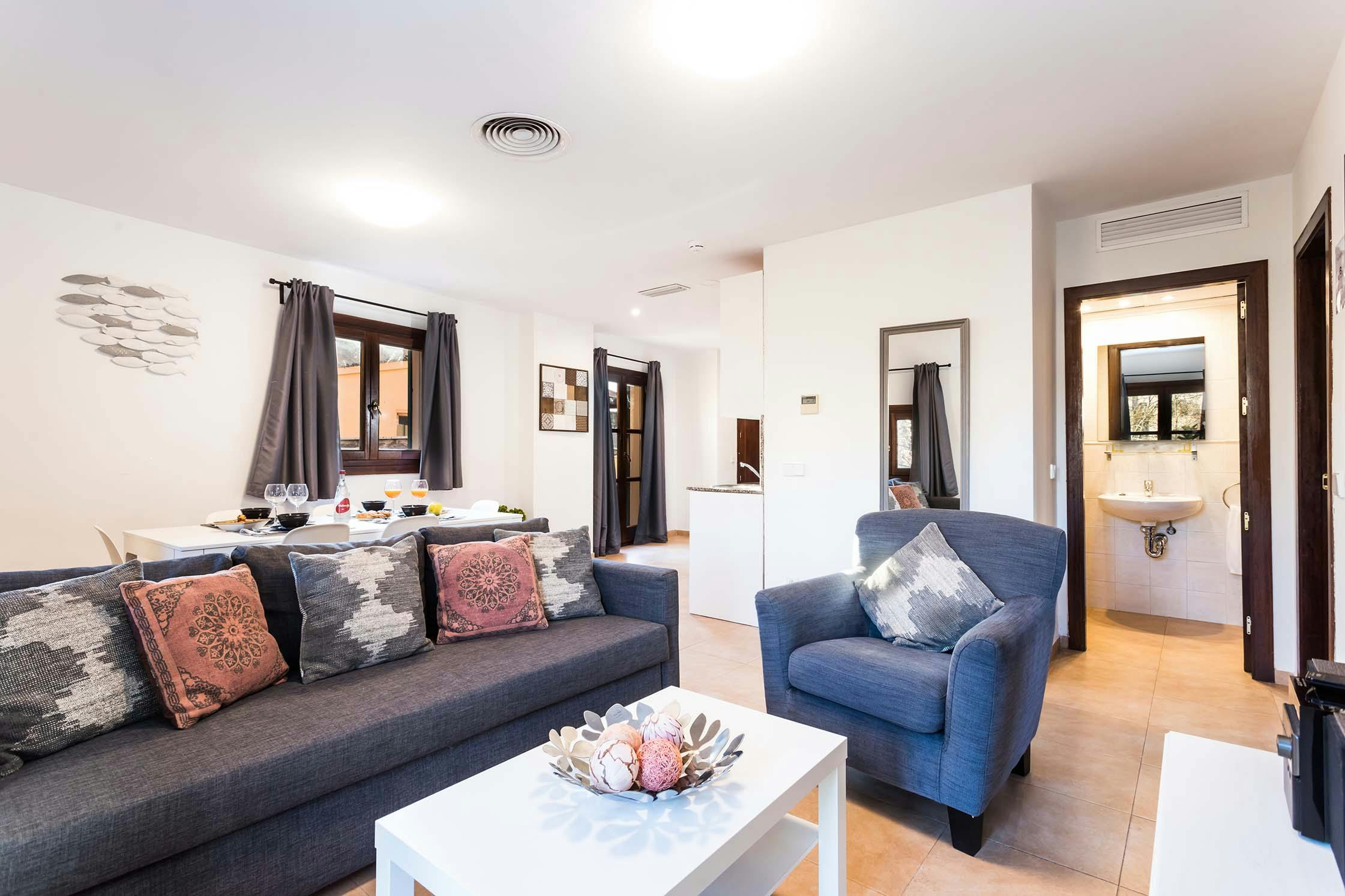80 m² apartment with two bedrooms, a bathroom and an open-plan kitchen in the living room. One room has a large bed of 1.80 m x 2 m and the other a bed of 1.40 m by 90 cm. The bathroom is equipped with a sink, toilet and shower. It has toiletries and towels for all guests. The living and dining area are integrated and furnished with a three-seater sofa bed, a table for 4 people, a 49" flat screen television and a music system. The kitchen is equipped with a refrigerator, ceramic hob, sink for washing dishes including cloth, scouring pad and dish soap, microwave, oven, dishwasher, washer dryer, iron and ironing board. It has basic cooking utensils such as plates, glasses, bottle opener, cutlery, frying pan, pot, chopping wood, large knife, cups, bowls, spare garbage bag, mop bucket, broom and cleaning products. All rooms in the apartment have free Wi-Fi and a hairdryer.